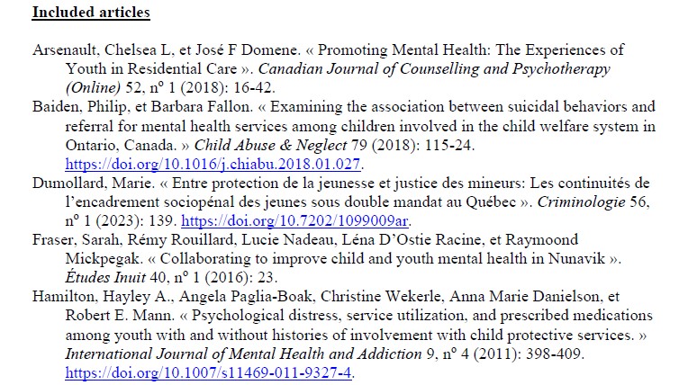 Nous avons compilé des articles de presse et des réflexions provenant de 2023 et 2024 sur l’état actuel des services de protection de la jeunesse et de santé mentale afin de fournir un contexte supplémentaire pour nos discussions avec les travailleurs jeunesse, les jeunes ayant vécu des expériences, et les organisations communautaires. Ces ressources nous ont permis d’approfondir nos échanges et d’enrichir la compréhension des enjeux auxquels sont confrontés les jeunes dans le cadre des services de protection et de soutien en santé mentale.