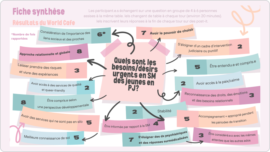 Concernant le second point, ces dernier.e.s ont mis en lumière la nécessité d’améliorer les conditions de travail des intervenant.e.s, de leur offrir de la supervision et des formations cliniques, de promouvoir une plus grande flexibilité institutionnelle et d’intégrer davantage de soins adaptés pour mieux accompagner les jeunes dans leurs besoins en santé mentale.